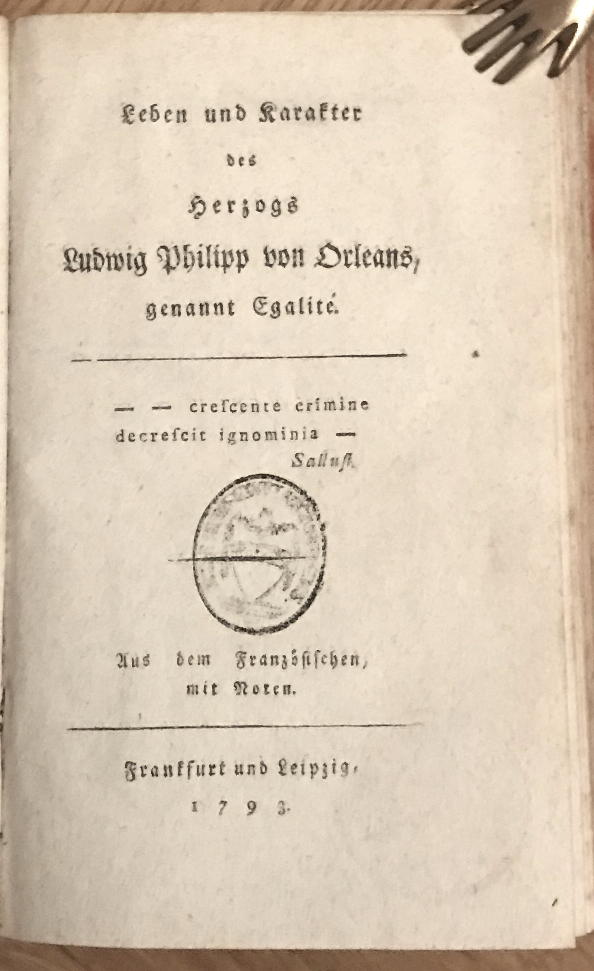 Die Glocke der Stunde in drei Zügen.. O. O., 1813. 3 Tle. in 2 Heften 86 S. (durchgehend paginiert). Rückenbroschur. Loh 160 (Erstmals 1812 erschienen). - Tl. 1 mit Restaurierungen am Titelblatt, dadurch verso etwas Buchstabenverlust. Tl. 3 am Titel mit kurzem geklebten Einriss. Antiquariat TurszynskiBuchzahl: 11983 € 45.00 | CHF 55.5] Katalog: Französische Revolution und Napoleon