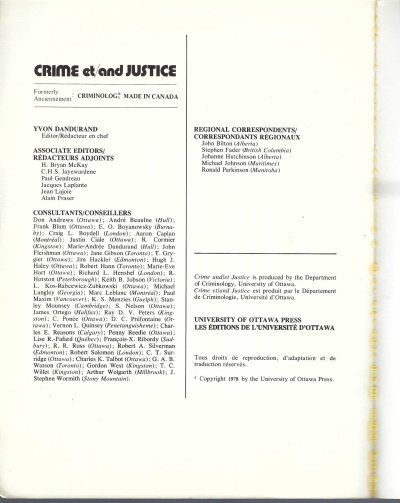 DANDURAND YVON - Crime Et / and Justice Volume 6, No 1,2,3,4, 1978 University of Ottawa Press, 1978. Paperback. Four Periodicals in Very Good condition. Tightly bound copies with unmarked interiors. The august copy has a number written on the front cover. French / English language. ; 10 "; 76 pages. Very Good .